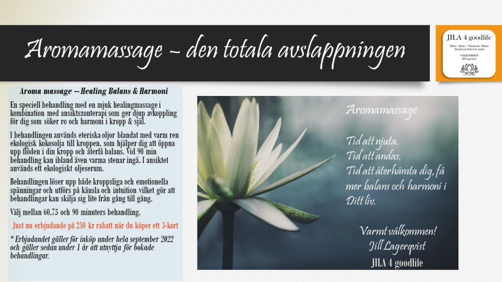 Jag hälsar er alla varmt välkomna och gör som jag gör (ibland) – var själsnälla och skapa utrymme att ta hand om er själva! Ingen ångrar en skön behandling 😉 Kramar från Jill