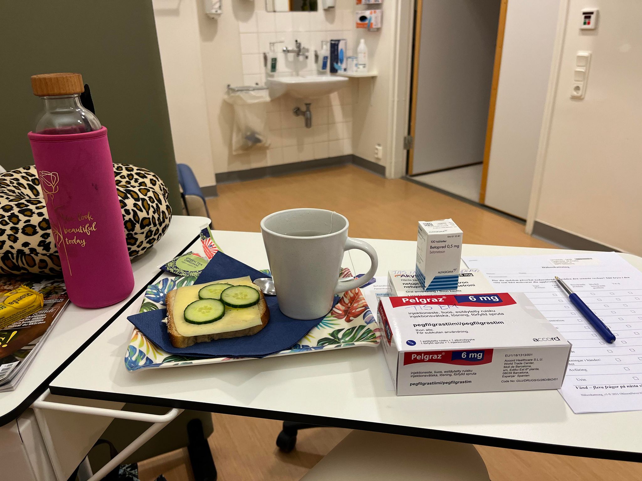 Den ena sköterskan följde med mig och visade mig till väntrummet med nästa punkt: Cellgiftet… ok, just do it! Satt jag utanför och peppade mig själv med 😉 Jag blev hämtad av min kontaktsköterska som gick runt med mig och så fick jag välja en plats. Tog ett rum med 2 fåtöljer som visserligen helt klart såg ut som sjukhus, men de såg nya ut och hade finesser med att fälla, höja/sänka mm. Där slog jag mig ner och packade upp lite som jag hade med mig i väskan. En korsordstidning, en tidning med olika vårinspirationer, nackkudden i leopard, vattenflaska och några små kex. De kom och erbjöd mig fika: Antingen kunde jag få rulltårta! ”Oj, neeeej tack! Det är ju massa socker i! Ni behöver inte erbjuda mig kakor framöver”, fick jag fram nästan lite väl spontant och förskräckt 😂 Då log sköterskan och sa att de även hade macka och så fick jag välja te eller kaffe. Efter att jag hade säkerhetsställt ännu en gång om att jag säkerligen inte skulle börja må illa eftersom jag fått mediciner för detta tidigare, så bestämde jag mig för macka och grönt te.