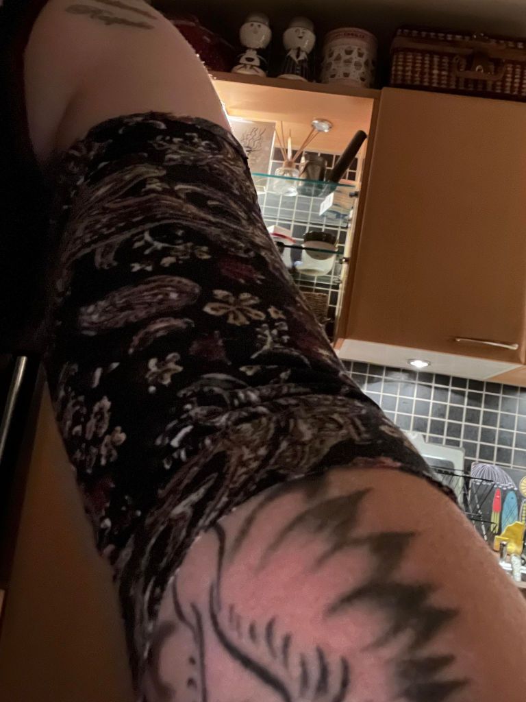 När jag skulle lägga mig så fick jag känslan av att jag kommer trassla och kanske dra bort bandaget på armen. Så då satte kreativitetsdelen i hjärnan fart och jag stegade in i min egen lilla loppishörna med massor av kläder. Där hittade jag en långärmad tunika som jag måttade till och klippte av ena ärmen på. Det blir min sovpyjamas på armen. Jag är alldeles för varm av mig för att sova med långärmat, så detta blev ju en riktigt bra lösning! Ska kolla om jag kan ta någon annan långärmad tröja och göra lite snyggare som jag kan täcka bandaget med när jag är utanför dörrarna. Ser ju lite bättre ut än att ha det där vita nätet på armen tänker jag i alla fall nu 🙂 kanske kommer jag inte bry mig sen?