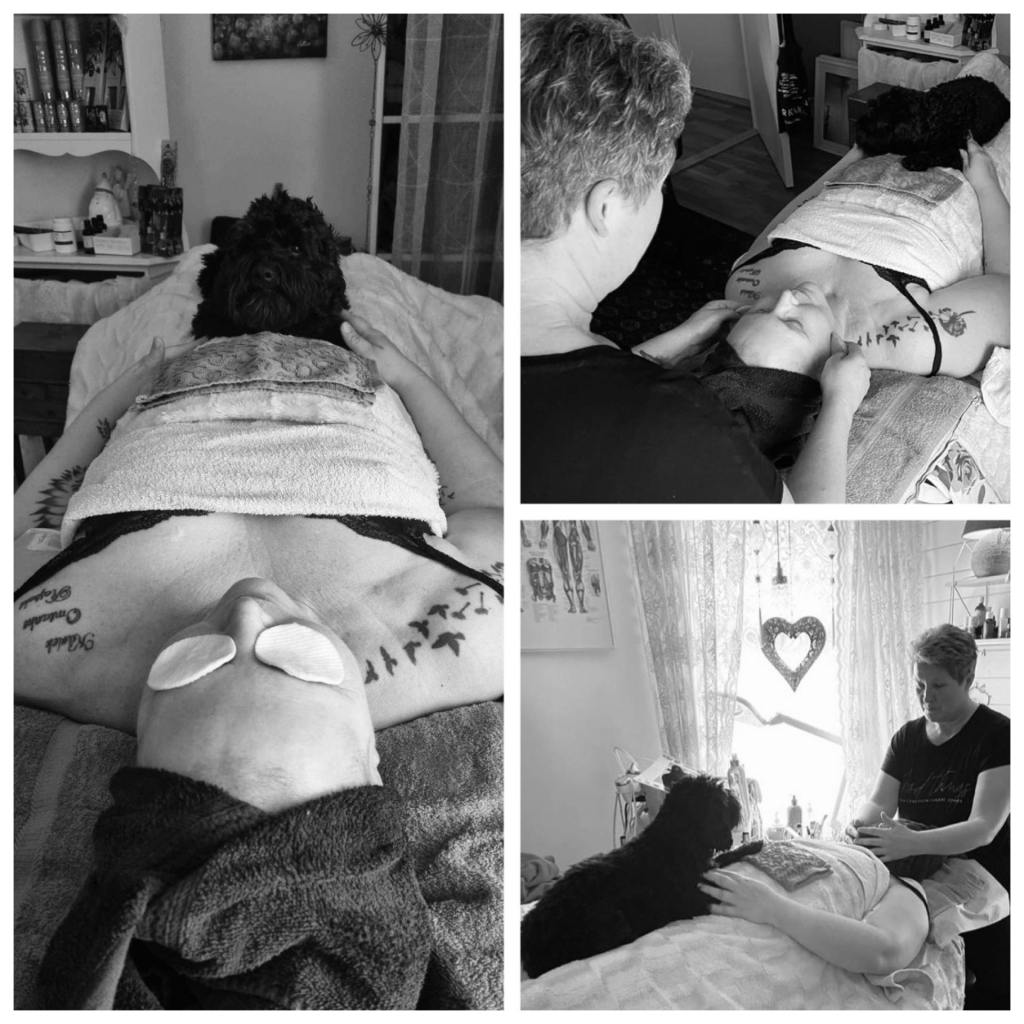 Sune hoppade upp en stund och ville mysa med sin matte. Sliten och trött hud tvättades och masserades bort och huden blev mjuk & len igen. Vilken lyx för mig det här va! Igår hade jag 2 Pernillor här och den ena gav mig behandling och den andra fixade supergod mat till oss. Att få lov att ha det såhär är galet bra! Vänner 💕💕