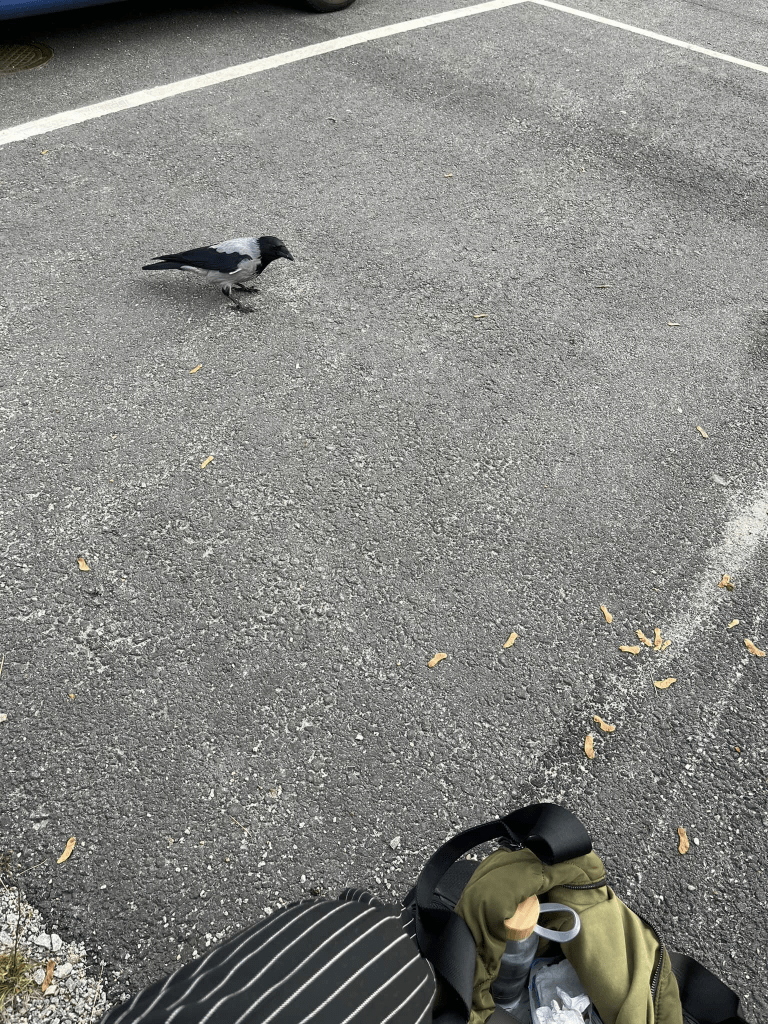 När jag kom fram till Karlskrona igår så hade jag gott om tid. En koll i backspegeln fick mig att rygga tillbaka. Oj, jag ser ju helt fördärvad ut! Rödgråten och blek bestämde jag mig för att sätta mig på räcket vid parkeringsplatsen en stund. Det var frisk luft och solen kikade fram mellan molnen. Jag hade en macka med mig och en flaska vatten. Det prasslade till på andra sidan räcket vid slänten nedanför… där kom en kaja hoppande och kikade på mig. ”Har du macka?” såg det ut som att den frågade… ”Ja, vill du smaka?” sa jag 🙂 ”Ja tack”, sa Kajan och hoppade fram på behörigt avstånd. Så satt vi där på räcket och åt macka, jag och Kajan. Jag skrev en historia igår på facebook om det och log när jag skrev. Det här är typiskt mig! vet jag att jag tänkte, Mitt sätt att vända mitt mående har alltid varit att hitta något med humor i. Så när jag faller, så tar jag mig själv i kragen och vänder på pannkakan för att se något fint i livet.