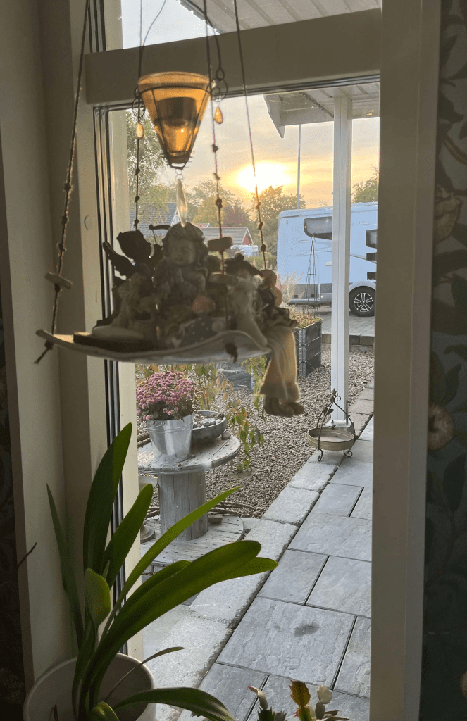 Jag äger förmågan att se skönheten i det lilla. När sonen åker iväg till jobbet så kikar jag ut varje morgon. Den här morgonen möttes jag av en rosafärgad himmel och solen som fick molnen att spricka upp och lysa mig i ögonen. ”I det lilla bor det vackra” som Ernst The handyman brukar säga.